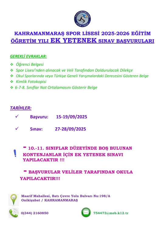 OKULUMUZDA BOŞ BULUNAN KONTENJANLAR İÇİN YAPILAN EK YETENEK SINAVLARINDA; 9. SINIFLARDA KONTENJAN OLMADIĞI İÇİN 9. SINIFLAR DÜZEYİNDE EK YETENEK SINAVI YAPILMAYACAKTIR. BOŞ KONTENJAN BULUNAN 10. SINIFLARDA VE 11.SINIFLARDA BOŞ KONTENJANLAR MUKABİLİNDE ÖĞRENCİ YERLEŞTİRİLECEKTİR, YERLEŞTİEME İŞLEMLERİYLE İLGİLİ BİLGİLERE AFİŞTEN ULAŞABİLİRSİNİZ.