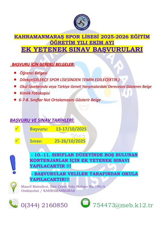 OKULUMUZDA BOŞ BULUNAN KONTENJANLAR İÇİN YAPILAN EK YETENEK SINAVLARINDA; 9. SINIFLARDA KONTENJAN OLMADIĞI İÇİN 9. SINIFLAR DÜZEYİNDE EK YETENEK SINAVI YAPILMAYACAKTIR. BOŞ KONTENJAN BULUNAN 10. SINIFLARDA VE 11.SINIFLARDA BOŞ KONTENJANLAR MUKABİLİNDE ÖĞRENCİ YERLEŞTİRİLECEKTİR, YERLEŞTİEME İŞLEMLERİYLE İLGİLİ BİLGİLERE AFİŞTEN ULAŞABİLİRSİNİZ.